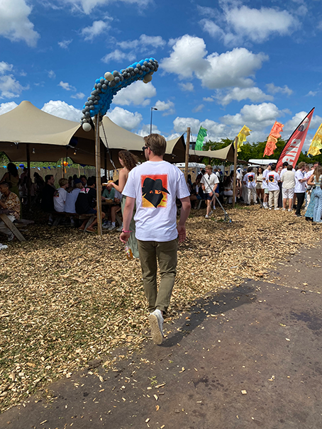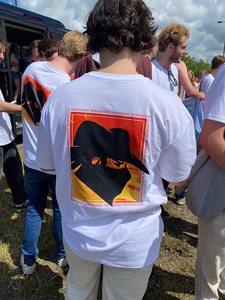 Desperado is a vertical group of men’s yearclubs who wanted a t shirt matching with the name Desperado. The bright red en yellow in the background gives the black bandit a strong appearance.