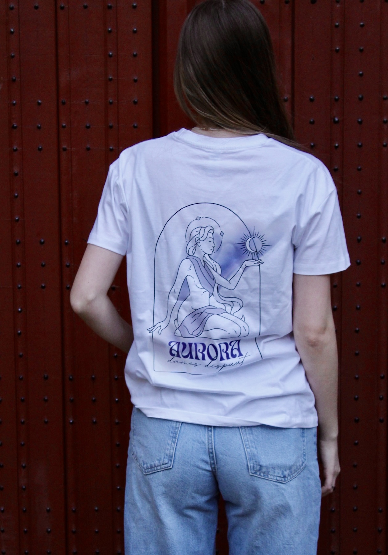 Aurora stands for both the goddess Aurora and the captivating Northern Lights. This combination is beautifully represented in the design I created for the logo and the T-shirt. The soft colors that fade into the background symbolize the ethereal quality of the Northern Lights, creating a serene and enchanting atmosphere. This design not only captures the magic of nature but also embodies the grace and inspiration associated with the goddess, inviting wearers to connect with both beauty and wonder.