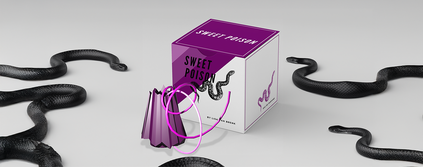 Sweet Poison is a self-designed virtual perfume brand that I created. I generated the perfume bottle using Blender, carefully incorporating a snake theme into the design. The sleek and elegant bottle features subtle snake-inspired details, symbolizing both allure and danger, which align with the mysterious and captivating essence of the fragrance. This virtual concept blends creativity and digital craftsmanship, offering a unique visual identity for the perfume brand.